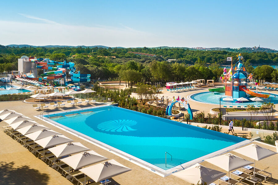 Het zwembad en paleo park Camping Mon Perin in Kroatië in het plaatsje Bale
