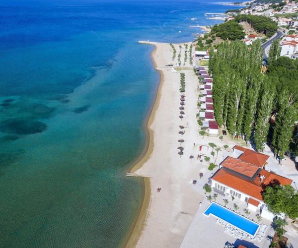 Hier kun je ver de zee in lopen zonder dat het water diep wordt, ideaal voor een zorgeloze duik. Dit ruime zandstrand van 800 meter lang is perfect voor allerlei activiteiten, waaronder beachvolleybal, voetbal en jetskiën. Zoek verkoeling bij de strandbar of huur een parasol voor wat schaduw.