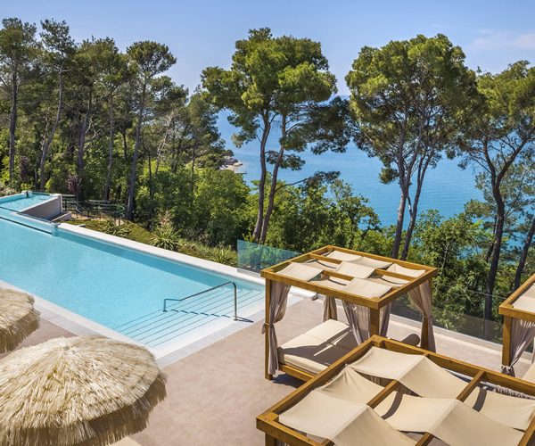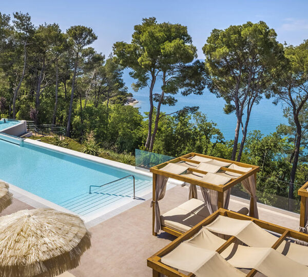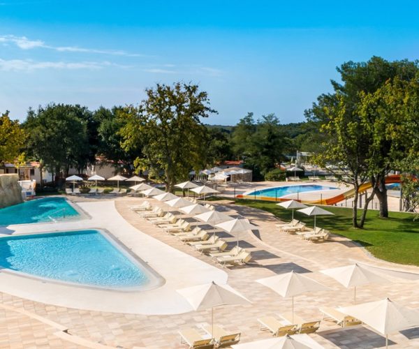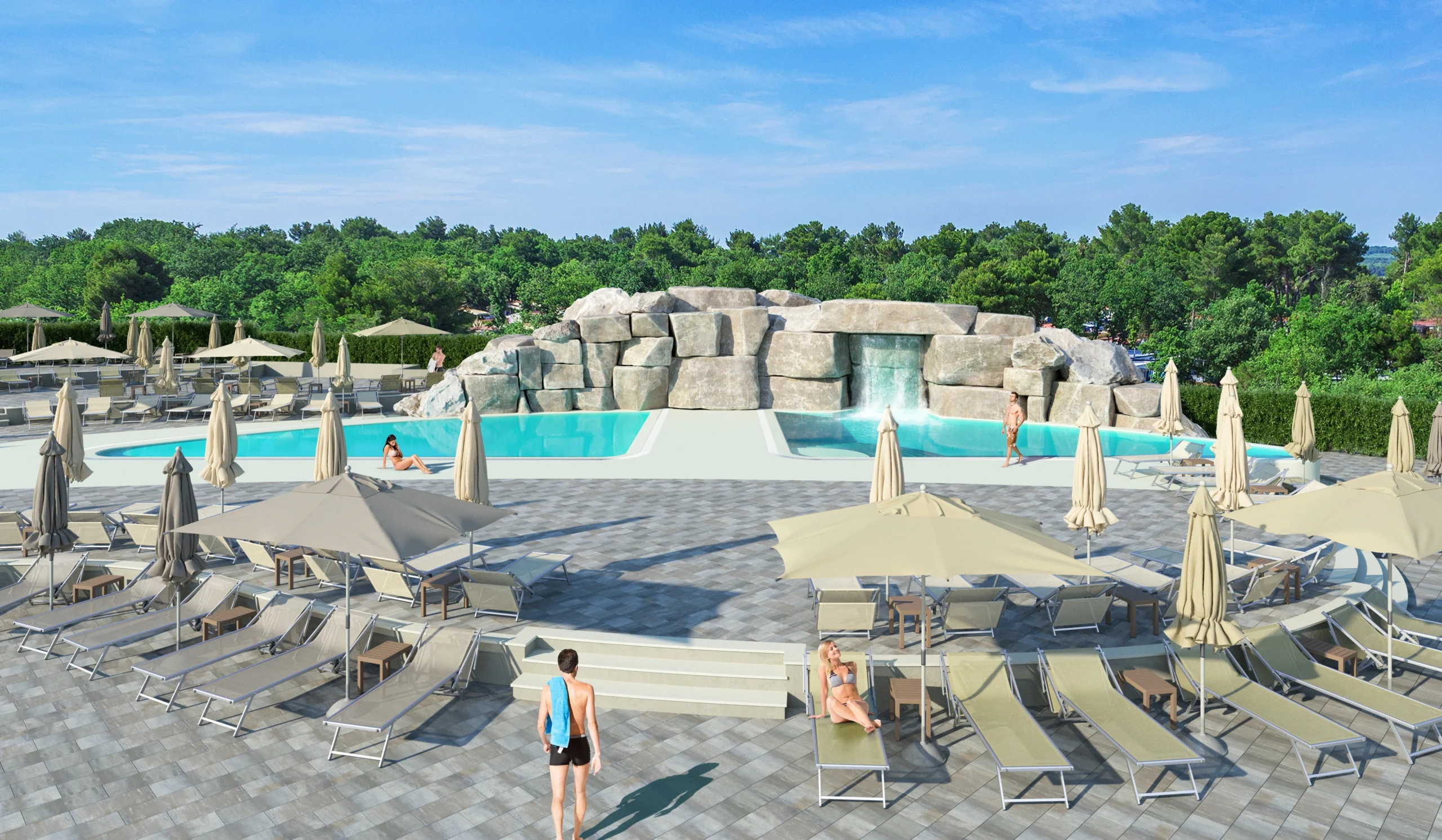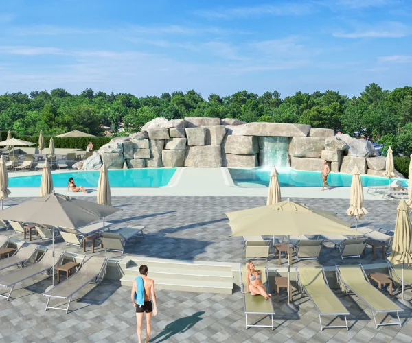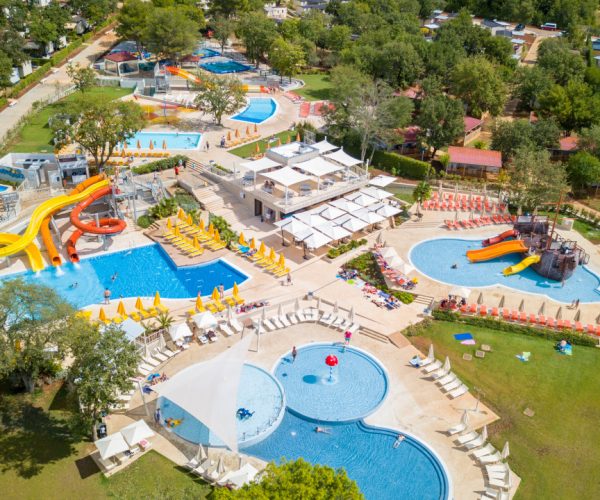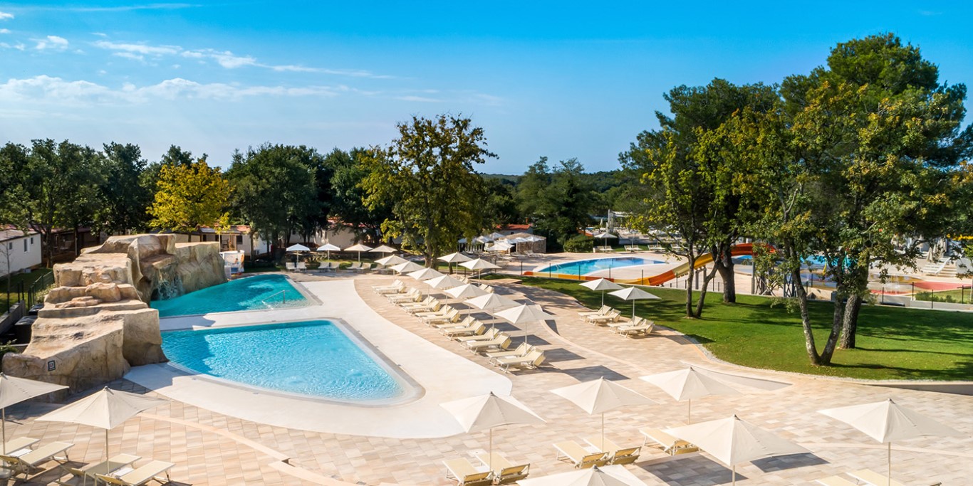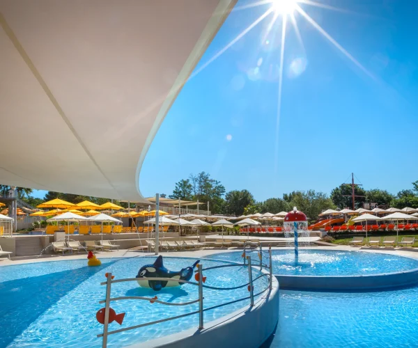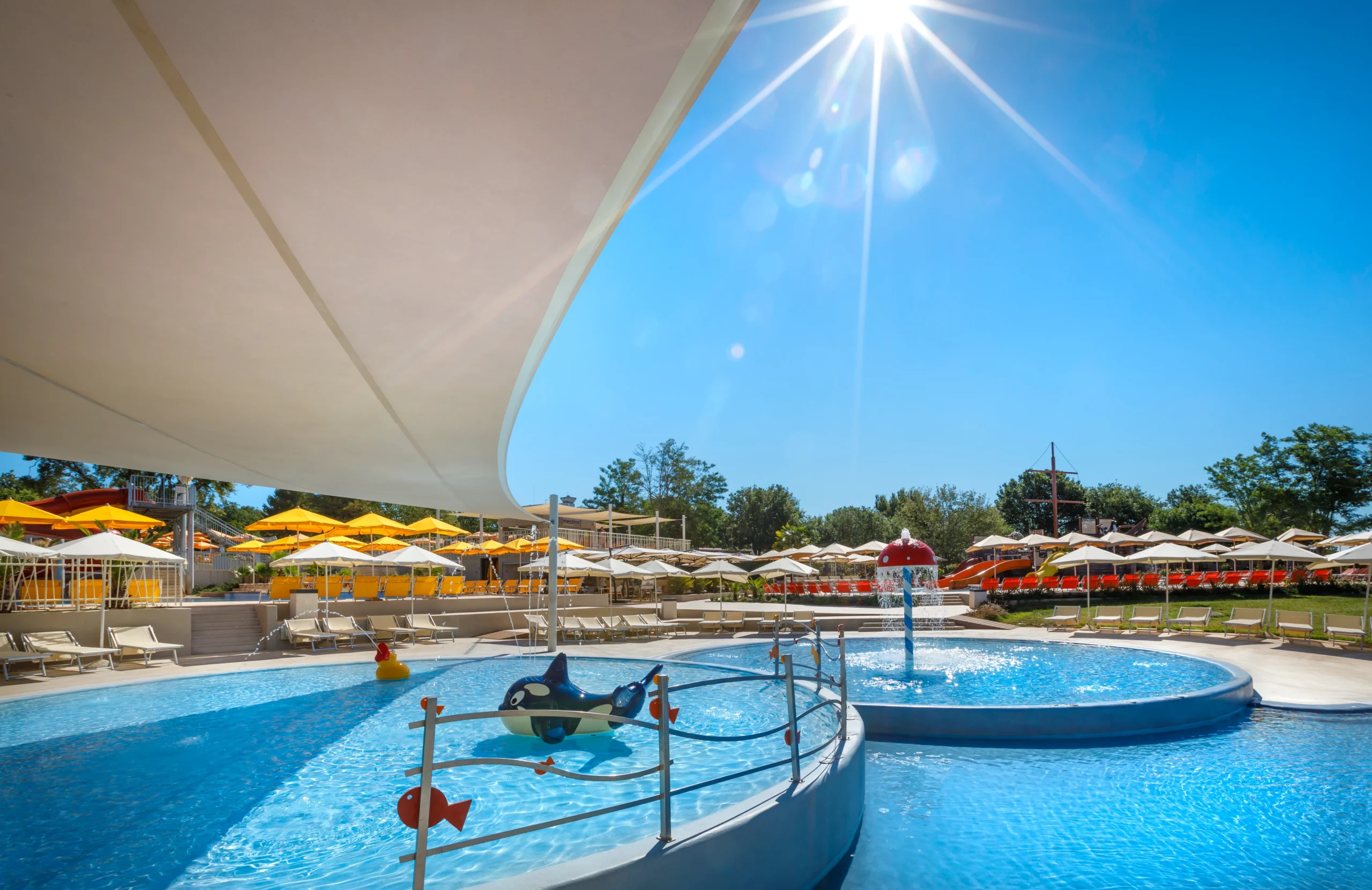 Het hoofdzwembad bij het Romana strand heeft een speciale allure, met zwembaden gevuld met zeewater en zoetwater, hydromassages, kinderattracties en uitgebreide zonneterrassen bij de zwembaden, compleet met een poolbar. Bezoekers van het glamping dorp en Punto Blu Premium Village kunnen ook genieten van exclusieve zwembaden. Gasten van het glamping-dorp hebben toegang tot een zoetwaterzwembad, en gasten van Punto Blu Premium Village kunnen zich vermaken in een aantrekkelijk overloopzwembad met een spectaculair panoramisch uitzicht op de monding van de rivier de Mirna en de zonsondergangen over de Adriatische Zee.