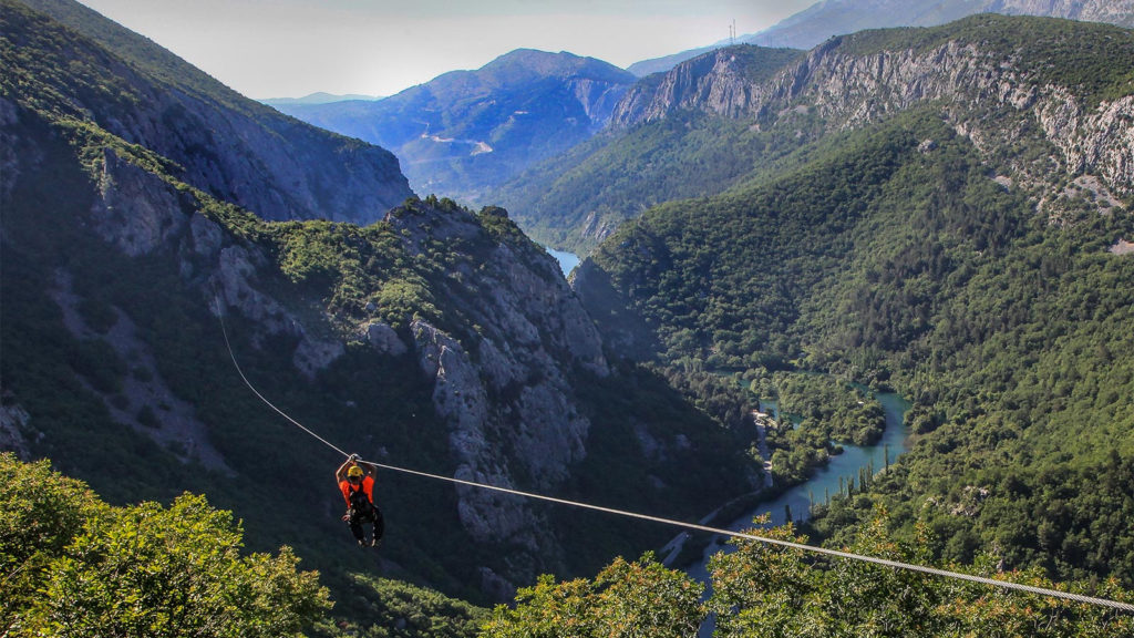 De zipline van Omis is een van de meest opwindende activiteiten in Kroatië. Het is een outdoor-activiteit waarbij je tussen bergen en over rivieren zoeft terwijl je een geweldig uitzicht hebt op de natuurlijke omgeving. De totale lengte van de zipline is 2,1 kilometer en is aan elkaar verbonden door 6 lijnen. Je zweeft op zo’n 150(!) meter boven de grond en wordt begeleid door verschillende professionals.