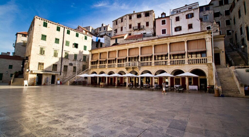 Vlak achter de St. Jakob kathedraal ligt het stadhuis en het stadhuisplein van Šibenik. Het werd oorspronkelijk gebouwd in de 16e eeuw in de Renaissance-stijl en heeft door de jaren heen verschillende renovaties ondergaan.